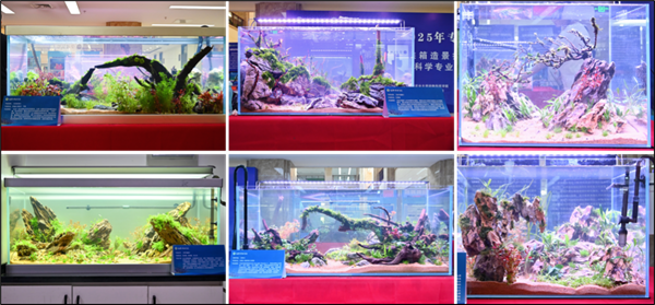 水产养殖专业、动物科学专业以及国际教育学院动科专业、环科专业共21支队伍参加此次比赛,创作出《怪石嶙峋》、《洞天》、《枯木逢春》、《松韵谧渊》、《幽岩翠影 渌沼藏春》等一系列精美绝伦的水族箱造景作品,在有限的空间表现出主题思想与最佳美感效果,充分展现出学生的创作思维与艺术灵感。