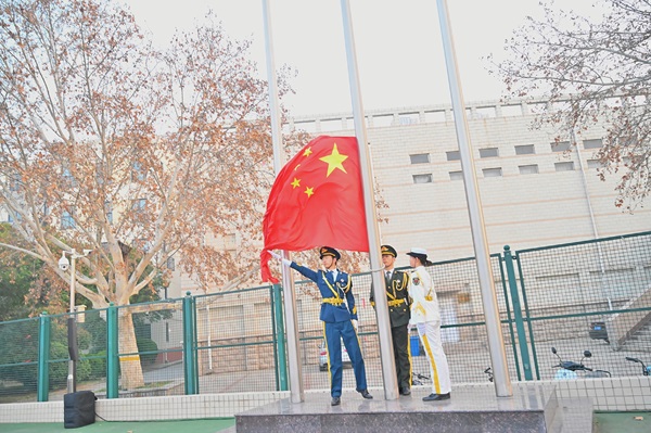 在全体师生的注视下,国旗护卫队迈着坚定有力的步伐将国旗护送至升旗台,伴随着慷慨激昂的《义勇军进行曲》奏响,五星红旗冉冉升起。全体师生神情肃穆,向着国旗行注目礼,眼中满含对祖国的敬重和热爱。