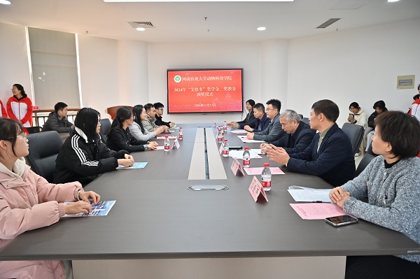 于龙子湖校区第一实验楼南501会议室举行2024年“艾格多”企业奖学金、奖教金颁奖仪式。河南艾格多科技集团有限公司总裁任振东与人资行政总监孙爱平、校友办主任胡明忠、色色直播