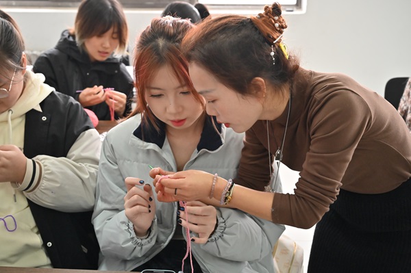 王芳向大家倾情传授针织玫瑰花勾花技巧,整个教学过程依步骤有条不紊地展开,现场学生聚精会神,并进行动手实践。期间,她与学生细心交流,为学生悉心指导。