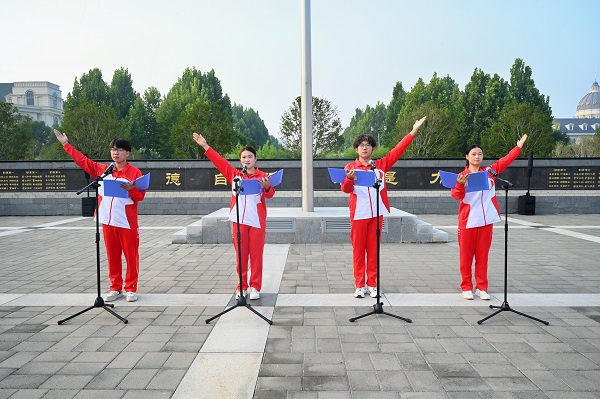伴随着雄壮嘹亮的《义勇军进行曲》,五星红旗迎着朝阳冉冉升起。在场师生庄严肃立,向国旗行着注目礼,心中充斥着满满的民族自豪感和对祖国的无限敬意。