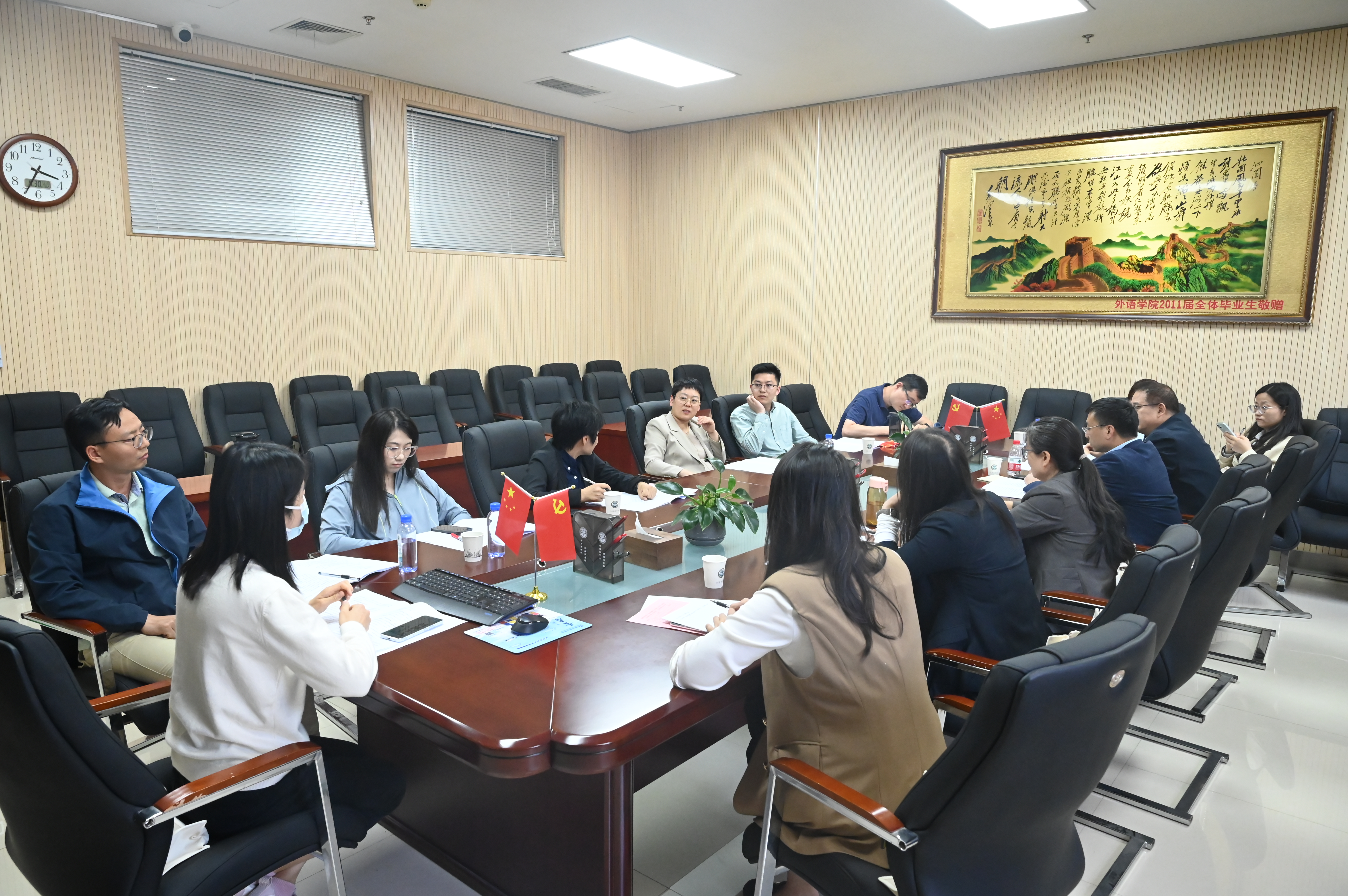 于龙子湖校区繁塔楼A324会议室召开一届六次教职工大会暨一届六次工会会员大会,院领导班子、全体教职工和特邀代表王成章教授参加会议。会议由院党委副书记、分工会主席郭娟主持。