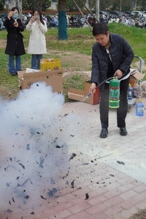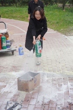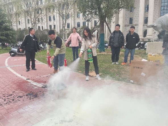 讲座结束后,在第一实验楼北门举行了现场灭火演练,曹玉臣强调了灭火器的使用方法和注意事项,酒梅菊和办公室主任朱晓艳带领师生参加了灭火演练。