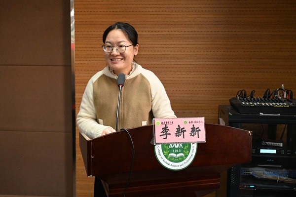 动物营养与饲料科学系教师李新新作为获奖教师代表发言,分享自身对河南艾格多科技集团的认识与了解,表示自己将以更加饱满的热情投入到教学科研当中,为培养人才贡献出自身力量,并期望能与公司相关领域研发人员进行深度合作,提高科技创新能力。
