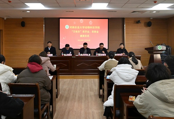 于龙子湖校区第一实验楼南321会议室举行2023年“艾格多”奖学金、奖教金颁奖仪式。河南艾格多科技集团总裁任振东与人资行政总监孙爱平、色色直播
