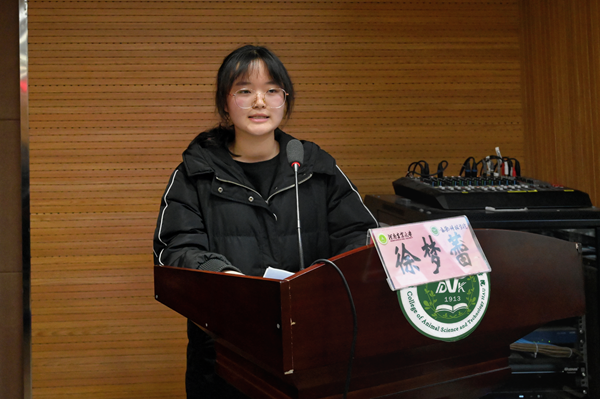 21级动科一班徐梦蕾作为获奖学生代表发言,向唐人神集团的慷慨支持表达感激之情,她认为专业知识与实践相结合才能实现专业价值,表示将继续厚植三农情怀,不断提高自身综合素养,不辜负学院和企业惜才育才的殷切期望。