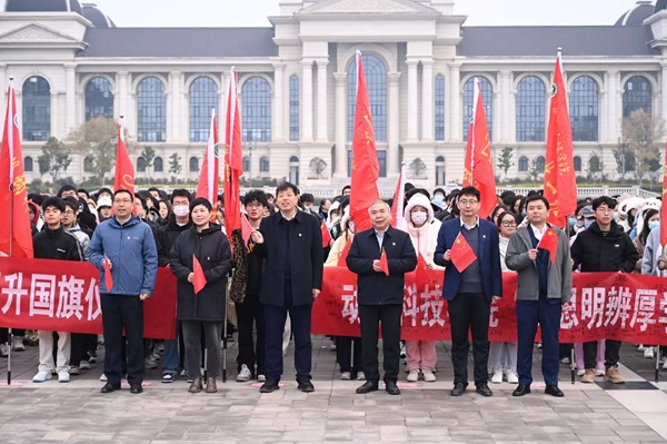 于龙子湖校区举行以“好学力行求真知,强国筑梦我担当”为主题的升旗仪式,学院领导班子及教师代表出席活动,2021级与2022级全体本科生参与升旗仪式,升旗仪式由副院长付彤主持。