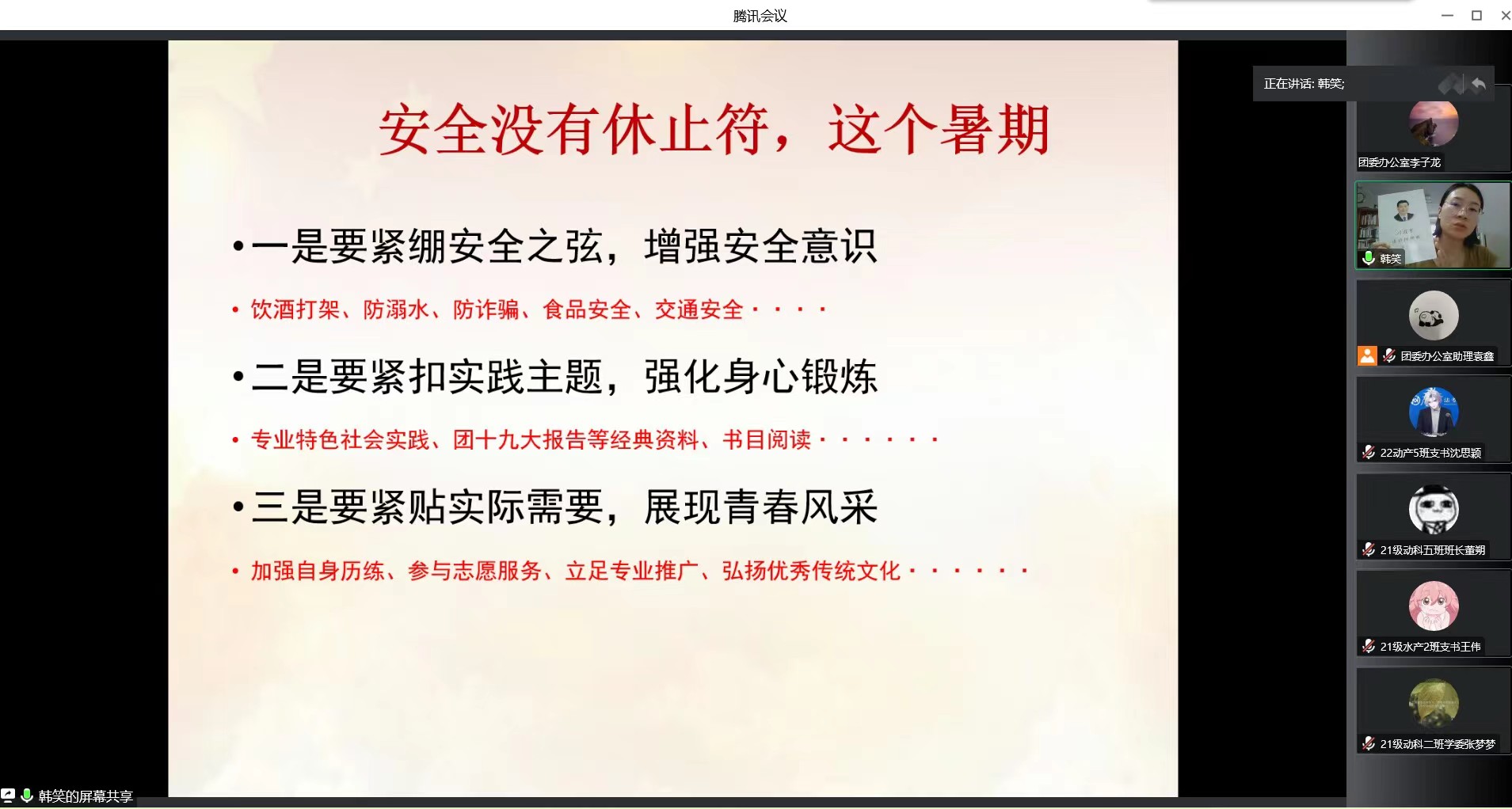 会上,韩笑首先传达了《关于2023年暑假期间留校学生住宿安排的通知》及《关于做好2023年暑期学生安全教育管理有关工作的通知》等文件精神,就人身、财物、交通、饮食、防疫、自然灾害以及政治安全等专项结合案例一一分类阐述。重点强调了防溺水、防诈骗、防非法宗教渗透等安全内容。