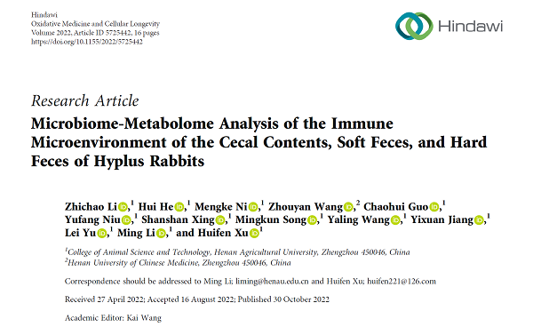 本网讯(通讯员 许会芬)日前,色色直播 李明教授科研团队通过多组学联合分析,探究了伊普吕兔盲肠容物、软粪和硬粪中免疫微环境的差异。微生物组和代谢组的结果发现,家兔的软粪中瘤胃菌属、毛螺旋菌属和克里斯滕森菌属含量丰富,并且丁酸的含量也较高,结果表明家兔可能是通过食粪行为获取更多的益生菌和短链脂肪酸,这对改善盲肠免疫微环境具有重要作用。10月30日,该成果在期刊Oxidative Medicine and Cellular Longevity(5年平均影响因子8.43)以Article形式在线发表。