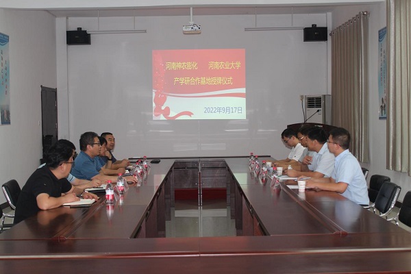 与河南神农膨化饲料科技有限公司举行产学研合作授牌仪式。院党委书记贾磊、动物营养与饲料科学系主任陈文教授、青年教师刘超齐、郭永鹏及神农膨化董事长董鹰隼、副董事长张良玉和企业部分高管出席授牌仪式。