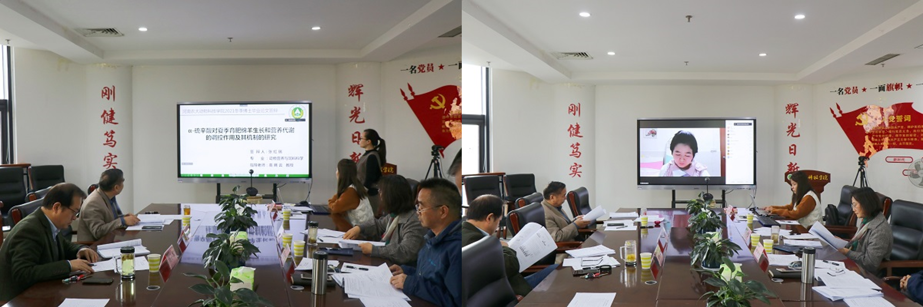 张红瑞博士、刘丹丹硕士等分别对“α-硫辛酸对夏季育肥绵羊生长和营养代谢的调控作用及其机制的研究”、“AdipoQ对蛋鸡下丘脑-垂体-卵巢轴生殖激素表达及卵泡生长发育的影响”等3篇学位论文从研究意义、研究内容、研究方法和研究结论等方面进行报告,答辩委员会委员针对答辩人陈述对其论文进行评议,并提出针对性问题及意见。答辩人员认真记录并表示会认真听取专家的宝贵建议和意见,对论文进行进一步修改完善。经答辩委员会商议和无记名投票,一致同意张红瑞博士和刘丹丹硕士的论文通过答辩。整个答辩过程公开透明,严谨公正,流程规范。