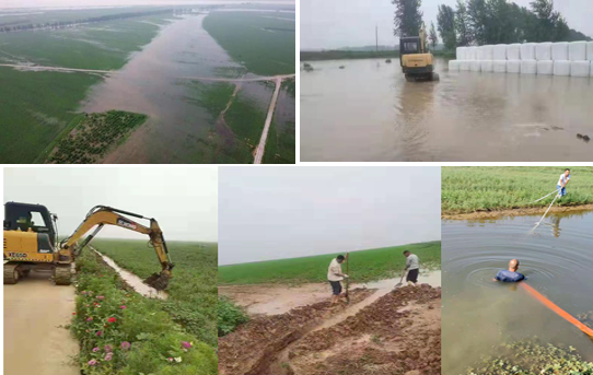近期,河南省部分地区发生特大暴雨洪涝灾害,给人民生产生活带来重大影响。各地饲草生产,特别是苜蓿、青贮玉米生产受到不同程度影响。兰考和长垣基地近6万亩苜蓿遭受水淹;部分裹包青贮苜蓿和干草捆受雨淋;荥阳基地800余亩苜蓿被冲毁,将近2米长的苜蓿根裸露在外;惠济区基地强降雨导致排水沟爆满,田间积水无法排出,大片苜蓿积水倒伏。