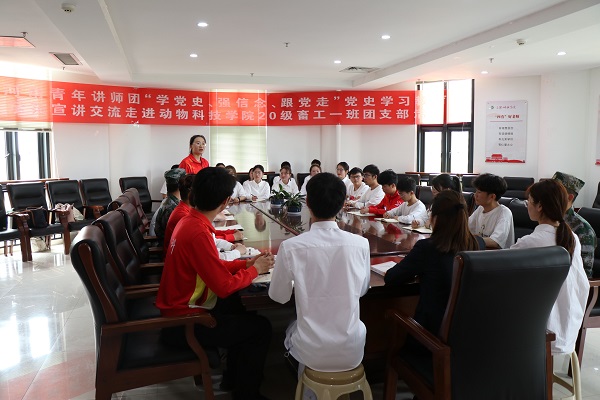 20级畜工一班团支部在第一实验楼北330开展“学党史、强信念、跟党走”党史学习教育,河南青年讲师团成员、马克思主义学院教师王俏蕊老师走进团支部,展开示范宣讲。