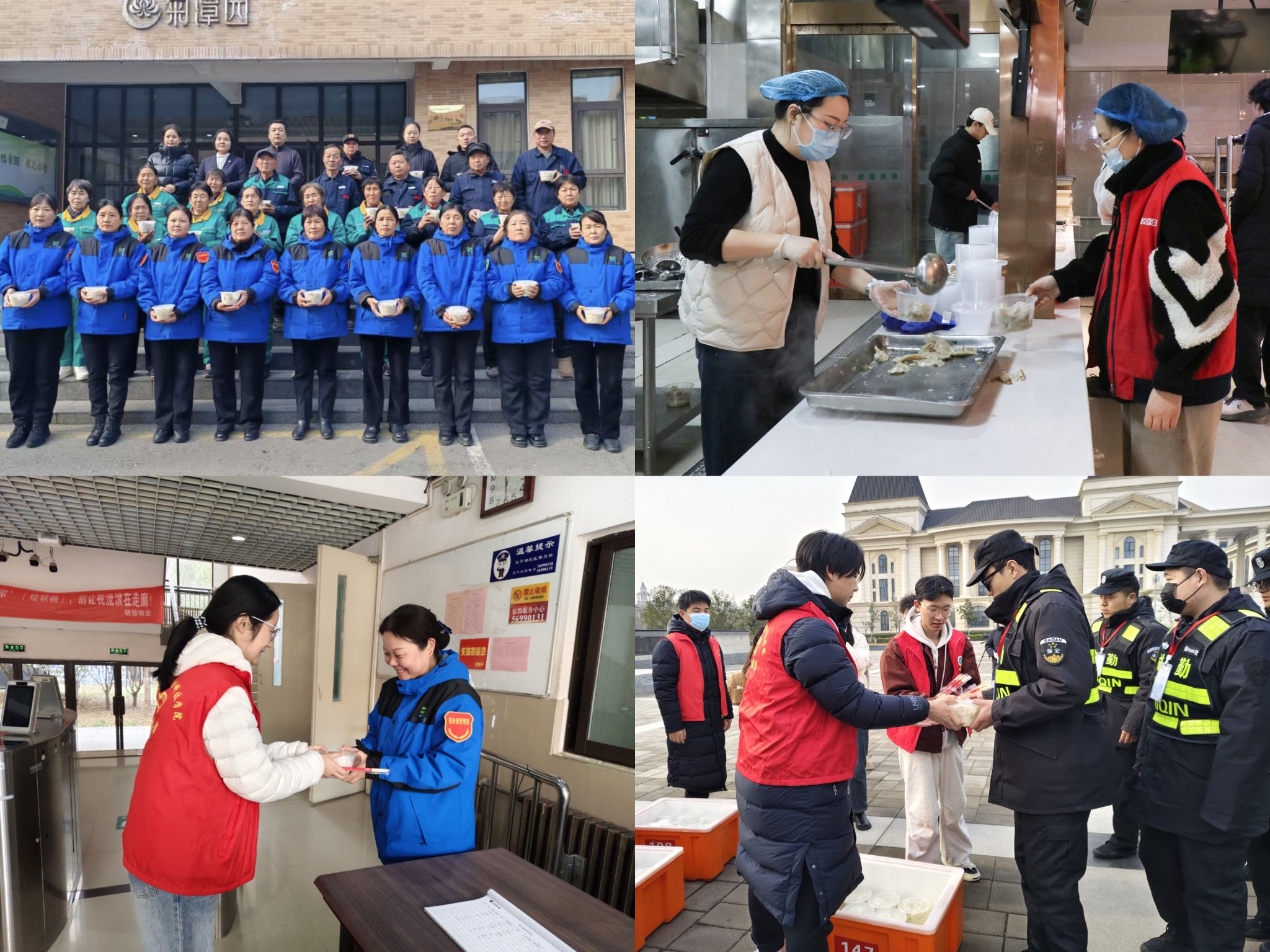 师生志愿者穿梭于校园各处,为安保大叔、保洁阿姨、宿管阿姨和食堂工作人员等送上热气腾腾的饺子,增添一份冬日“家”的温暖。
