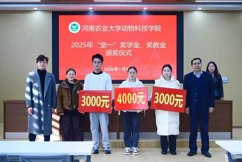 于龙子湖校区第一实验楼南508会议室举行2025年“宠一”奖学金、奖教金颁奖仪式。河南宠一生物科技有限公司创始人赵光彪、联合创始人刘琦、色色直播
