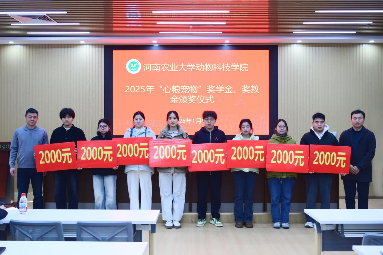 关于颁发2025年“心粮宠物”企业奖学金、奖教金的决定》,企业领导依次为获奖师生颁奖并合影留念。