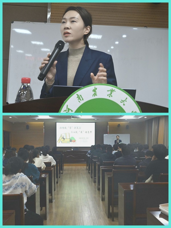 新生在实验楼南321会议室举行《大学六问》专题讲座,团委书记韩笑担任主讲。