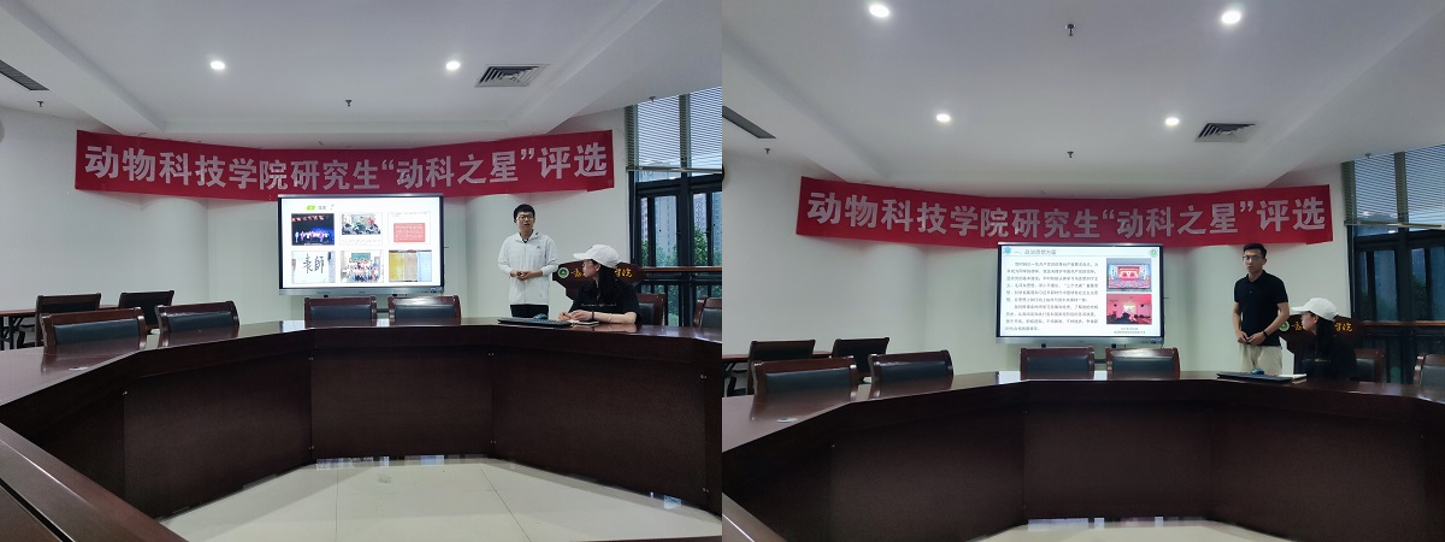 特于5月19日晚七点在第一实验楼北301开展第一届“动科之星”优秀研究生评选活动,由研究生辅导员张彦华老师、研究生会主席邵冰豪、研究生第二党支部书记宋明坤担任评委,研会学术部副部长邢珊珊为主持人。