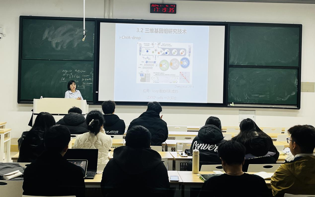 赵云霞主任以《猪基因组精细调控元件图谱构建及其应用》为题,介绍了表观基因组学的基本概念和研究范畴。她指出,表观基因组学是研究基因组修饰的综合性学科,这些修饰在DNA层面调控基因表达,对细胞分化、疾病发生及环境因素对基因表达的影响起着至关重要的作用。赵云霞主任还详细阐述了表观基因组学的研究方法和技术,包括ChIA-PET、Hi-C和ChIP-seq等,这些技术为科学家们深入探索基因组的奥秘提供了强有力的工具。赵主任以其深厚的学术背景和丰富的实践经验,为师生们揭示了表观基因组学的奥秘及其在科研和生产领域的广阔应用前景。