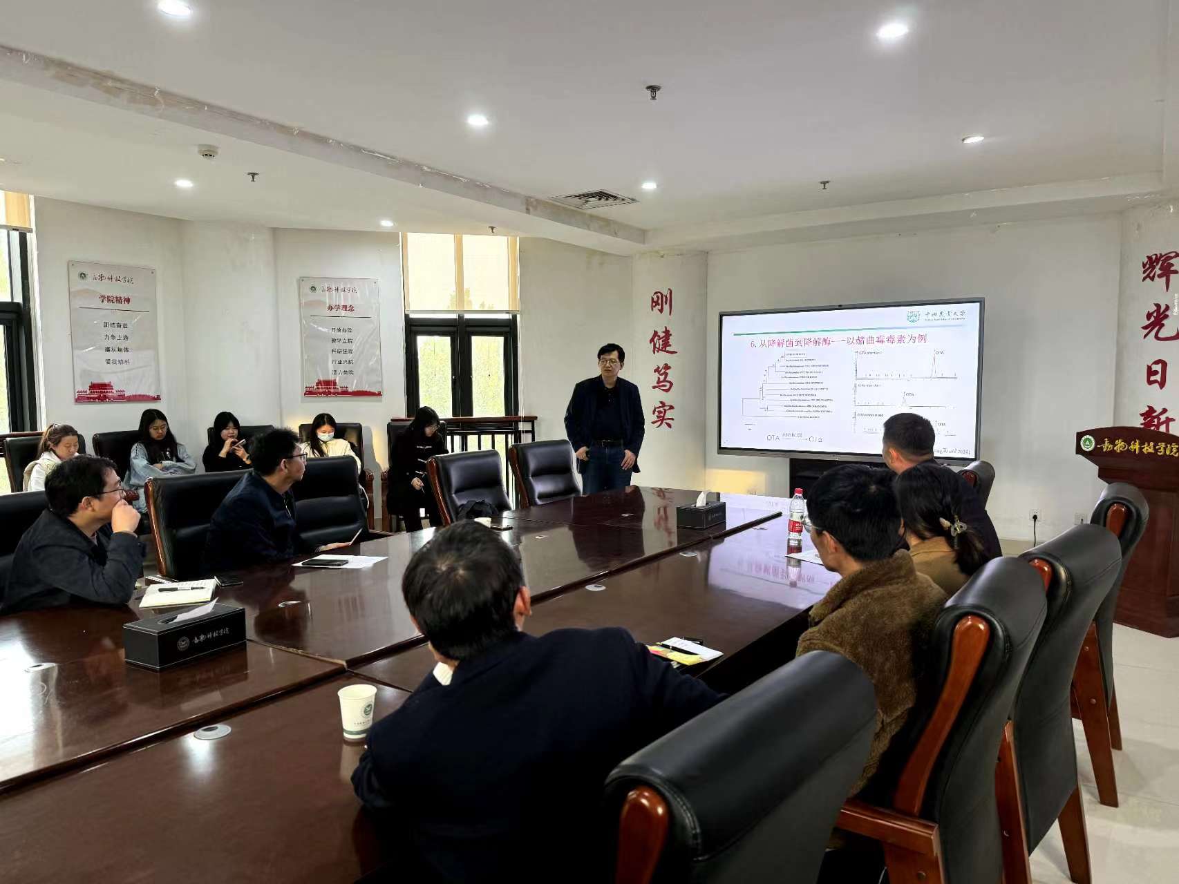 马秋刚教授以《饲料饲草真菌毒素生物降解技术研发进展》为题,介绍了饲料饲草真菌毒素污染危害,及其团队在真菌毒素生物降解菌应用方面所做的系统研究工作和相关成果,并阐述真菌毒素生物降解技术未来发展方向。最后,马老师同与会师生热烈讨论相关科研话题,给大家的课题研究提出了宝贵的意见。马老师的报告深入浅出,分享的内容丰富饱满,为色色直播 师生在真菌毒素生物降解方面提供了指导。