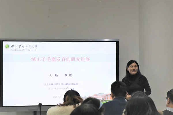 王昕教授以《绒山羊毛囊发育的研究进展》为题,通过简单介绍陕北白绒山羊,深入讲解了绒山羊毛囊发生发育中lncRNA的筛选与鉴定、绒山羊毛囊发生过程单细胞转录图谱的构建、褪黑素影响绒山羊HFSCs增殖与分化、绒山羊毛囊发生发育关键信号通路和基因的筛选和鉴定、Hoxc13对毛发角蛋白的调控及其自身的调控机制、DNA甲基化对绒山羊毛囊分化的调控六项研究结果,为色色直播