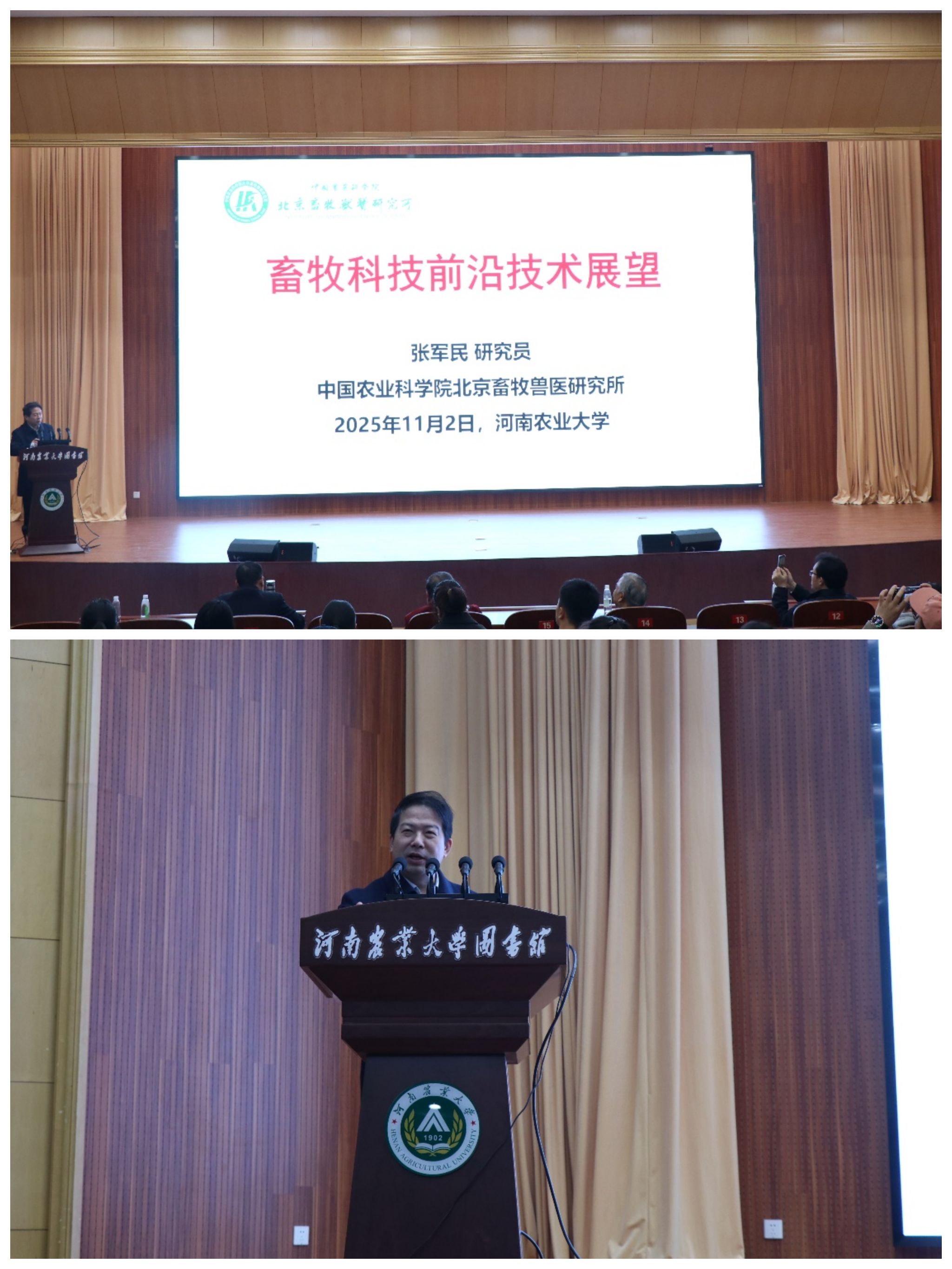 在龙子湖校区图书馆一楼报告厅举办第199期“日新论坛”,本次论坛特邀中国农业科学院北京畜牧兽医研究所所长张军民研究员带来题为《畜牧科技前沿技术发展与展望》的精彩报告。报告会由院长田亚东主持,中国农业科学院北京畜牧兽医研究所副所长唐湘方、研究生处王皓宇,中国现代农业联合研究生院食品营养与健康学部执行主任李明,牧原联合产业研究院执行院长付彤,动物医学院副院长王荣军,色色直播