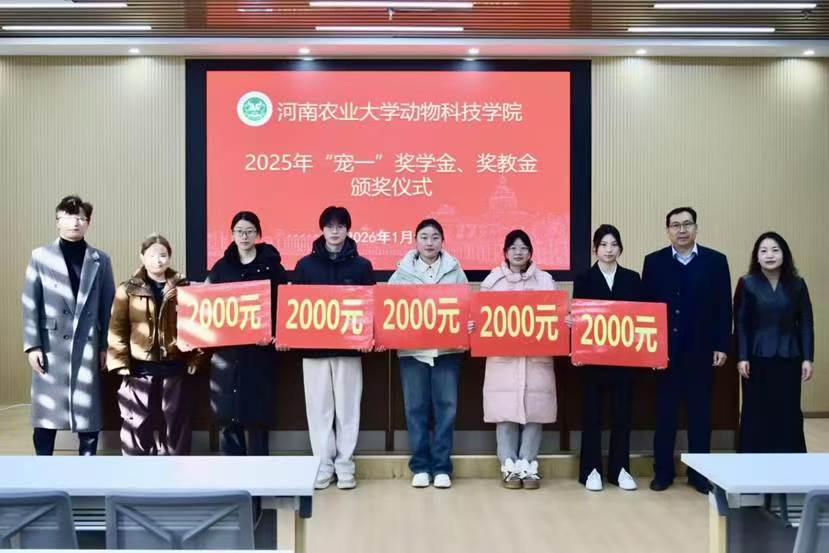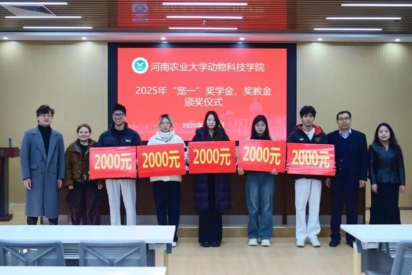于龙子湖校区第一实验楼南508会议室举行2025年“宠一”奖学金、奖教金颁奖仪式。河南宠一生物科技有限公司创始人赵光彪、联合创始人刘琦、色色直播