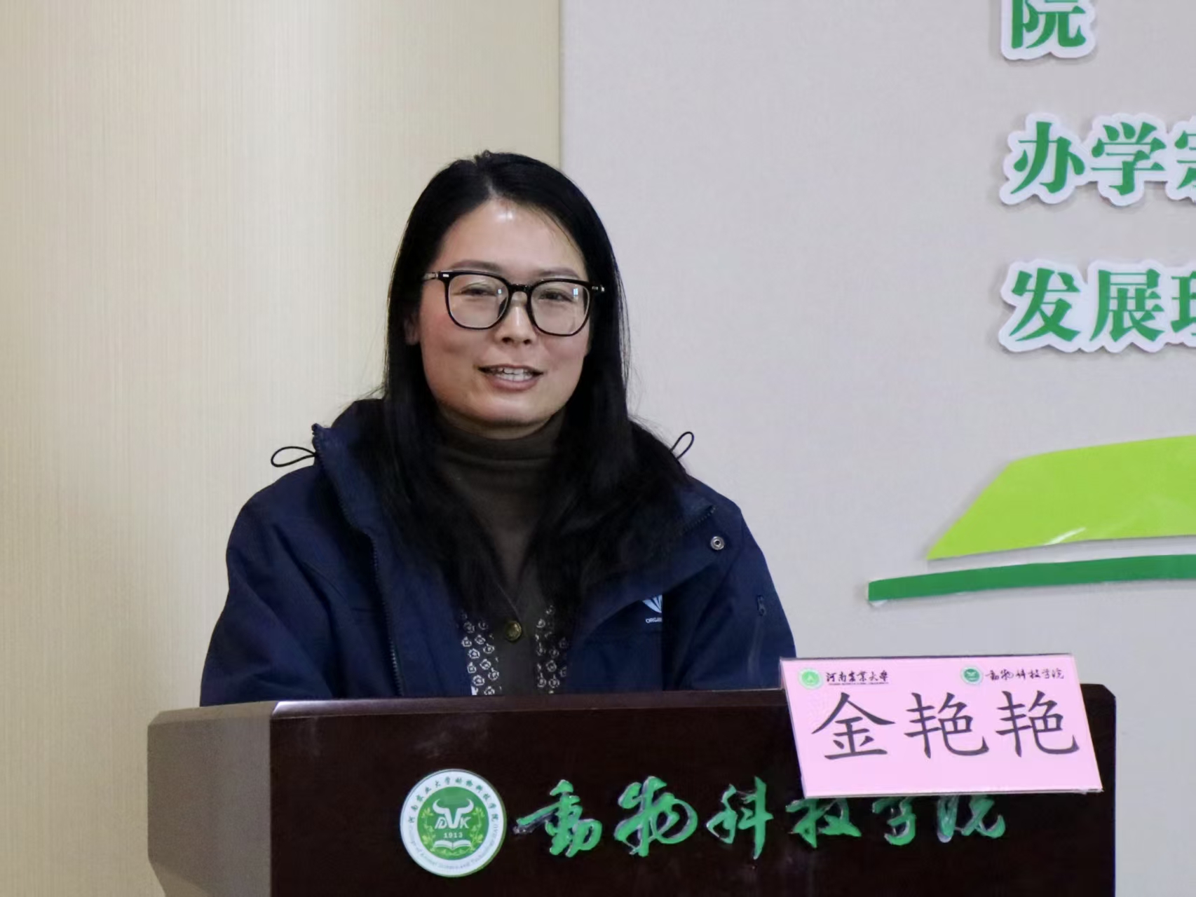 企业领导金艳艳讲话,她代表公司董事长表达了对获奖师生的祝贺,她指出公司核心团队多来自于畜牧专业领域,凭借深厚的行业积淀,扎根畜牧产业发展赛道。她表示,奖教金是对一线教师深耕讲台、播撒知识的崇高致敬,奖学金是对莘莘学子奋勇争先、佳绩频出的肯定与激励,希望师生能将这份荣誉转化为前行动力,持续在专业领域深耕探索,携手助力学院人才培养与专业建设再谱新篇。