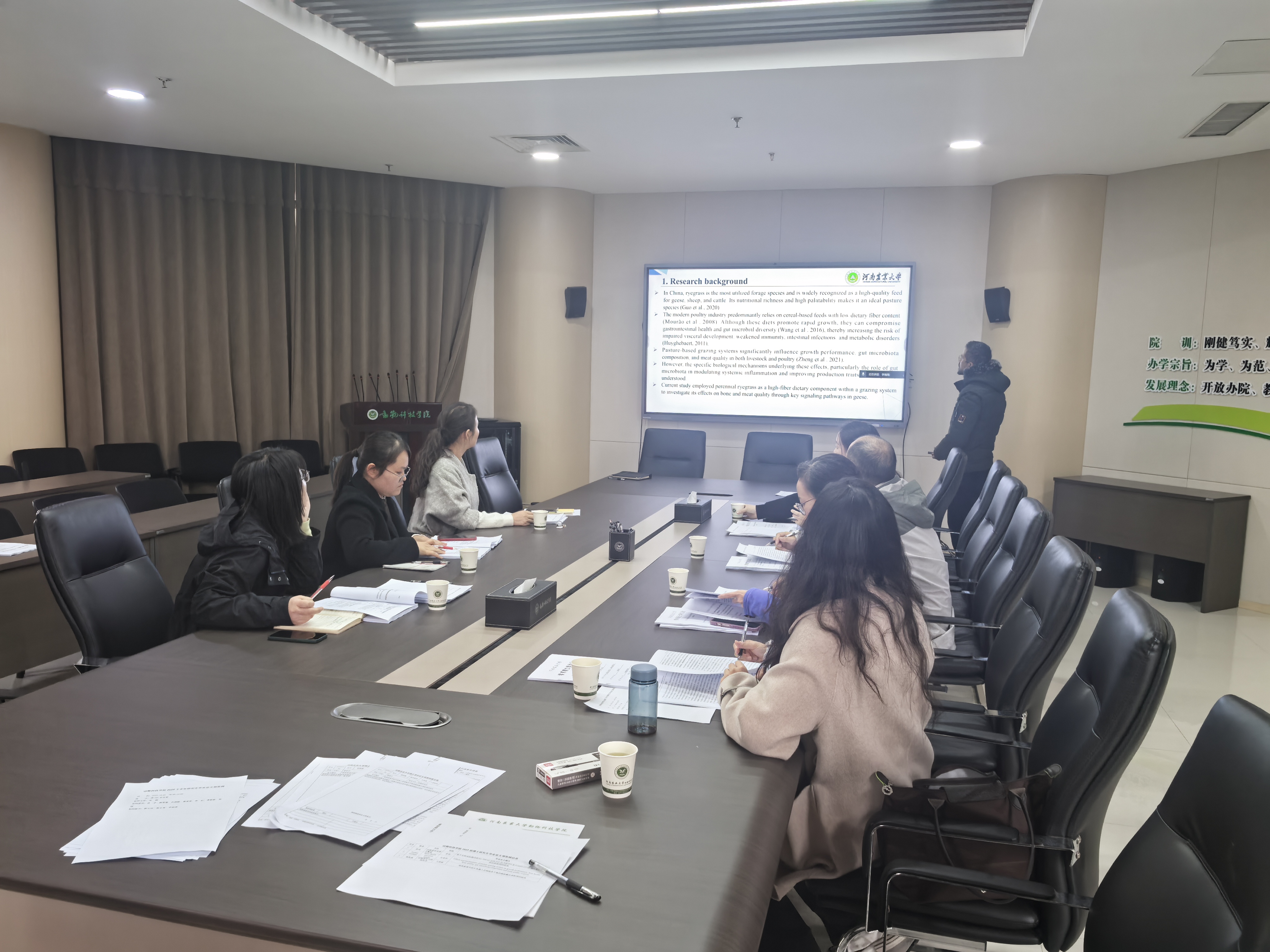 2025届博士毕业生陈悦、Zeshan Zulfiqar、杨斯涵分别对“基于全转录组测序的lnc-764-ssc-miR-432-5p-MBTPS及FOXP2-DYSF调控猪肌内脂肪沉积机制的研究”、“Effects and mechanisms of pasture grazing system on growth performance, liver health, bone quality, gut microbiota composition and meat quality of geese”、“褪黑素调节奶牛乳腺上皮细胞多不饱和脂肪酸合成机理的研究”共3篇学位论文从研究意义、研究内容、研究方法和研究结论等方面进行报告。预答辩委员会委员针对预答辩人陈述对其论文进行评议,并提出针对性问题及意见。预答辩人员认真记录并表示会认真听取各位老师的宝贵建议和意见,对论文进行进一步修改完善。